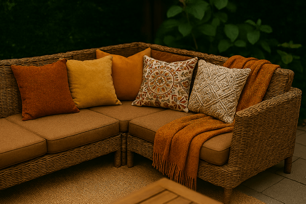 - Kies weerbestendige materialen zoals teakhout, aluminium of kunststof wicker